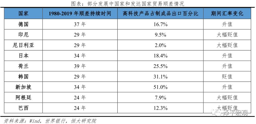 3.2 “高质量”的贸易顺差有助于汇率升值“高质量”的贸易顺差有助于一国货币保持强势。1980年以来,较长时间维持贸易顺差的国家包括:阿根廷、巴西、德国等,维持顺差时间在20-40年之间。整体来看,出口产品技术含量较高的经济体货币都有不同幅度的升值,如德国、日本、荷兰、新加坡等。而出口结构单一,过渡依赖铁矿石、有色金属、石油和农产品等初级产品出口的资源国,货币表现普遍偏弱,这其中包括印尼、阿根廷和巴西等。