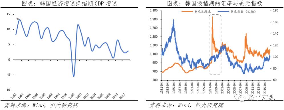下图显示期间的韩国GDP增速和汇率表现,其中,1992-1997年间是换挡期的上半场,政府拒绝经济减速,刺激并导致亚洲金融危机时期,汇率大幅贬值,1997年后,主动改革,换挡成功,汇率稳中有升。