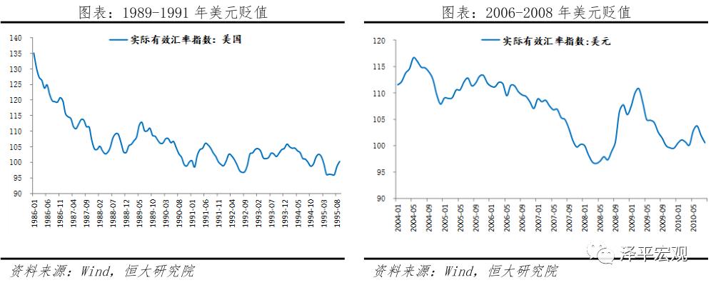 以美国为例,金融周期下半场,美元进入贬值通道。从美国过去两轮主要金融周期来看,金融周期达到波峰的时间分别为1989年1季度和2006年4季度,分别对应美国近年来的两次金融危机,储贷危机和次贷危机,经济增速下行甚至转正为负。而在其对应的金融周期下半场阶段,美元在1989-1991、2006-2008均进入贬值通道。