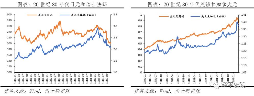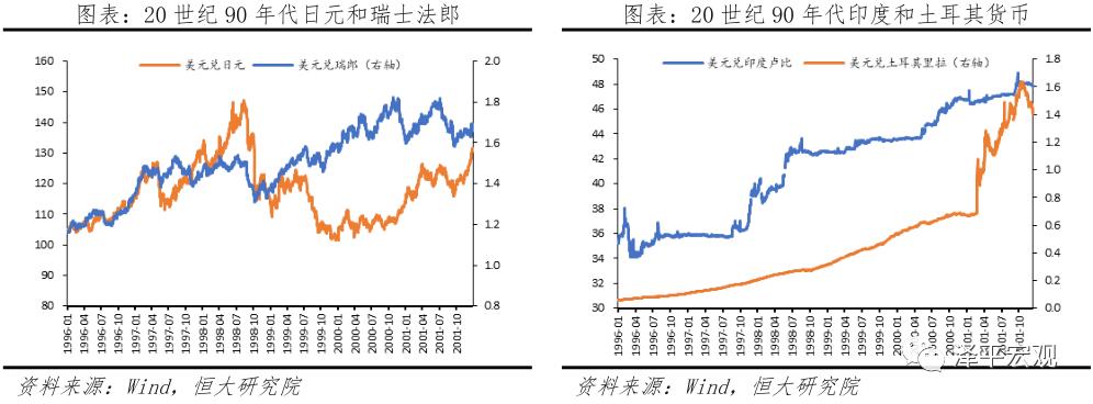 值得注意的是,两轮美元升值周期中,各国货币普遍贬值,鲜有例外。因为美元指数由发达国家货币构成,如果连德国、日本和瑞士这些“传统强队”都弱于美国,新兴货币只能更差。美元两次升值周期发生在80年代初和90年代末,这两次是比较强势的加息周期,强势美元下各国货币纷纷贬值。