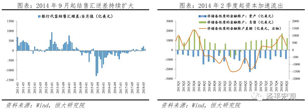2015年汇改未与市场进行有效沟通、居民及企业贬值预期加强,两大扰动因素共同加剧了这一阶段中长期因素主导下的人民币贬值。一方面,811汇改后的两天内,央行放任人民币对美元汇率贬值近4%,且未与市场有效沟通,在当时的背景下,刺激市场预期进一步失稳。另一方面,随着贬值预期的持续积累,居民、企业主动调整自身资产负债结构,增加海外资产投资、提前偿还外债,体现出“资产外币化、负债本币化”特点。资本加速流出,非储备性质金融账户差额自2014年2季度转负且逆差持续扩大。