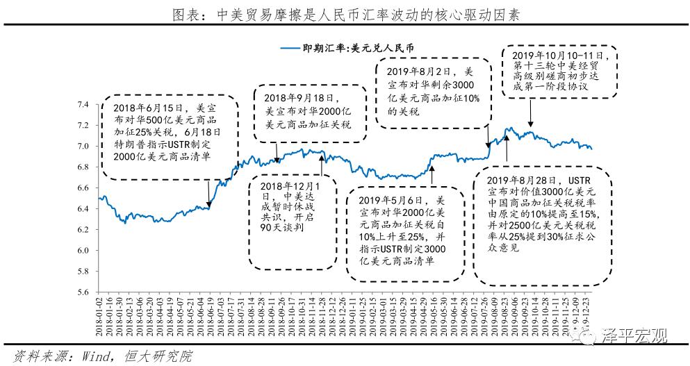 中美贸易摩擦是这一轮人民币汇率波动的核心驱动因素,贸易摩擦升级的关键时间段人民币均大幅贬值,而在摩擦缓和的阶段小幅回升。1)2018年5月至11月末,贬值压力加大。6月中旬,特朗普表示将对中国500亿美元商品加征25%关税并制定2000亿美元商品清单,9月18日美国对中国2000亿商品征税10%生效。人民币汇率从6.3持续贬至6.9。2)2018年12月至2019年4月,汇率小幅回升。2018年12月1日,中美达成停战共识并开启90天谈判,人民币汇率自6.9小幅回升至6.7。3)2019年5月至9月,人民币再度走贬,汇率“破7”。5月6日,美方宣布对华2000亿美元商品加征关税自10%上升至25%,并指示USTR制定3000亿美元商品清单,汇率快速走贬。8月2日,特朗普宣称将起对华剩余3000亿美元商品加征10%关税,直接刺激人民币离岸和在岸汇率双双“破7”。4)2019年10月至12月,贬值压力缓释。2019年10月,中美重启贸易谈判,人民币汇率从7.1微幅回升至7.0。
