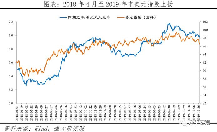 同时,这一阶段人民币汇率走势与美元指数变化基本一致,2018年4月至2019年末美元指数总体上扬,人民币汇率对应走贬。2018年4月以来,受益于美国基本面经济数据持续向好,欧日经济疲软、市场避险情绪上升,叠加特朗普税改和基建项目刺激资本回流美国,美元指数持续走强。2018年4月起,美元指数快速走高后高位企稳,总体呈上升趋势,由2018年4月初90上涨7%至2019年末96。