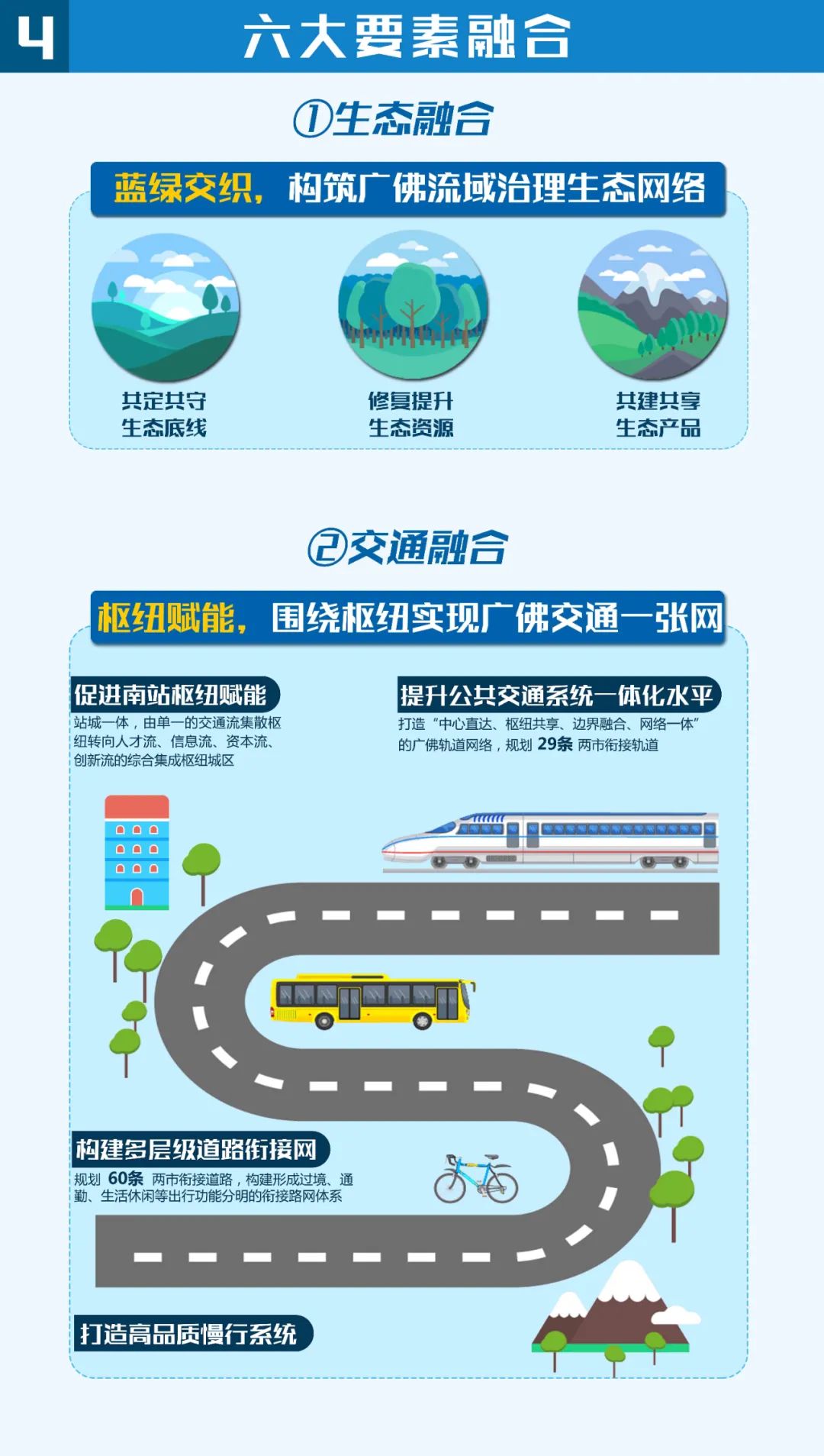 提升公共交通系统一体化水平,打造“中心直达、枢纽共享、边界融合、网络一体”的广佛轨道网络,规划29条两市衔接轨道。