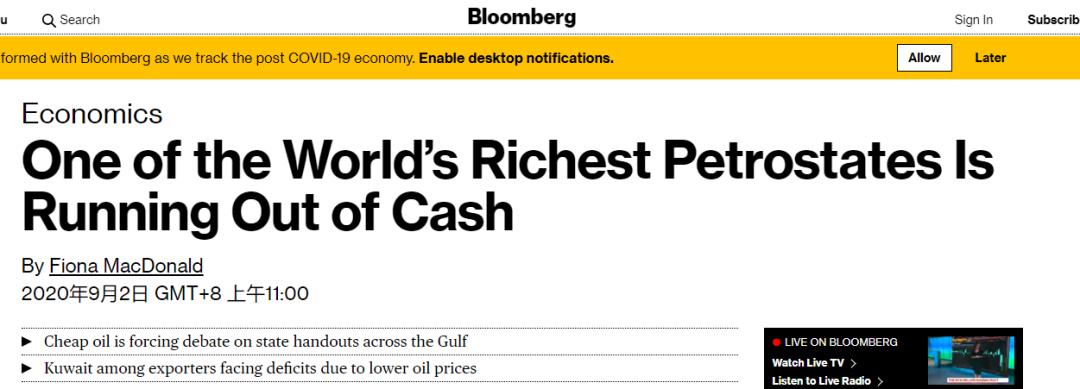 彭博社称,尽管石油输出国组织已经使原油价格从历史性的低位上调至40美元/桶,但这一价格仍然很低,而肆虐全球的新冠疫情和各国加紧发展可再生能源可能会让这一价格持续走低。数据显示,科威特今年的石油和天然气出口收入为530亿美元,只有2014年收入的一半左右。
