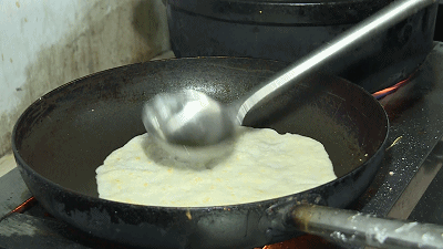 糯米粉揉制好后,分成相同大小的粉团,慢慢在锅里边煎边用锅铲压成一张薄饼,记得用小火,煎制一张饼需要十几分钟。再在上面均匀铺上或咸或甜的馅料,卷起来之后直接吃,或切成小块分食。