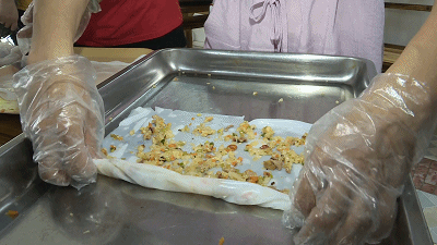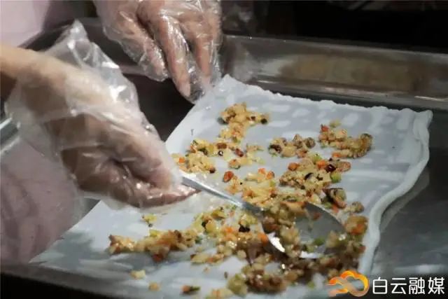 将马蹄、胡萝卜、香芹等切成细颗粒,然后炒熟备用,接着将粉皮铺开,馅料均匀铺上,卷起来就可以食用了。