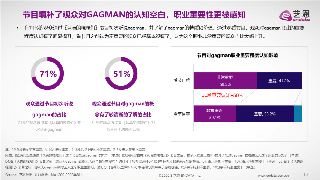 这档最初甚至没人知道选什么、该怎么选的节目,用一季综艺的时间,让综艺行业及受众第一次接触到gagman的概念。根据艺恩数据的一份报告,71%的用户因为节目首次听说了gagman,看过节目认为gagman非常重要的用户比例提升了超过50%。