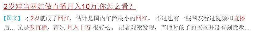 这些人早已不是单纯想“晒娃”的心态,而是想让视频“爆”,想让孩子“红”。毕竟在流量背后,是赤裸裸的利益。有新闻就曾经爆出来一个2岁女娃当网红,能给家庭带来10万元的月收入。