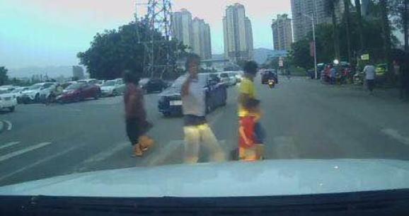 白衣男子开车从广联泰往国道方向行驶,发现有小孩子在道路边上玩耍,意识到情况危险,下车把孩子抱回安全的地方。