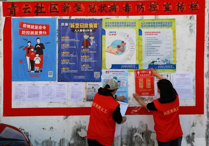 党员义工在宣传栏上张贴防疫海报 李渊深 摄