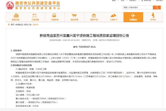 近日,《新建南通至苏州至嘉兴至宁波铁路工程地质勘察监理招标公告》在南京市公共资源交易中心发布。