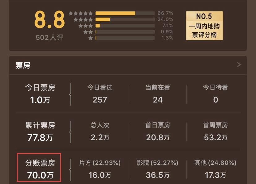在国内院线上映一周多,排片始终寥寥无几,累计票房仅70万。