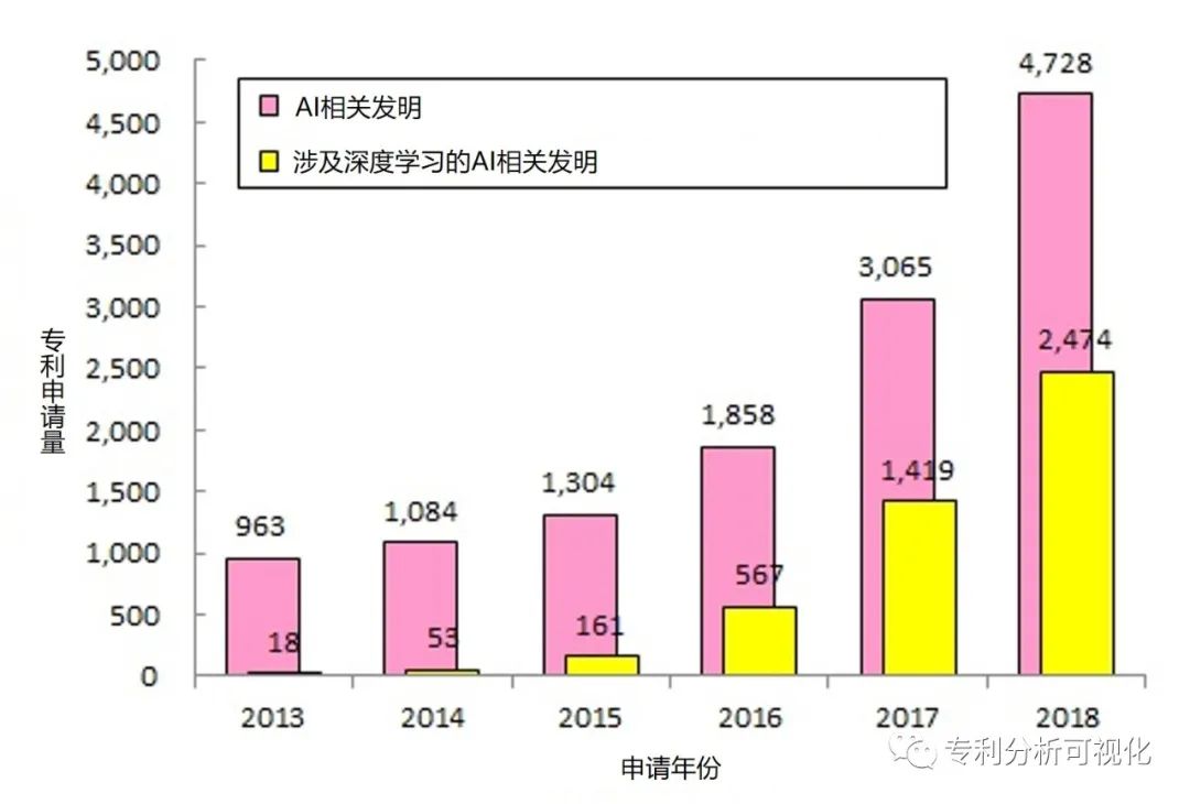 深度学习是人工智能技术的主要研究方向。在这股人工智能的研究热潮中,包括神经网络在内的机器学习发挥了主导作用。此外,与深度学习相关的发明正在迅速增加,2018年,近一半的人工智能相关发明在申请文件中涉及深度学习(图2)。