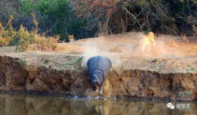河马就在狮子的疯狂折腾中,不紧不慢地走向河边。