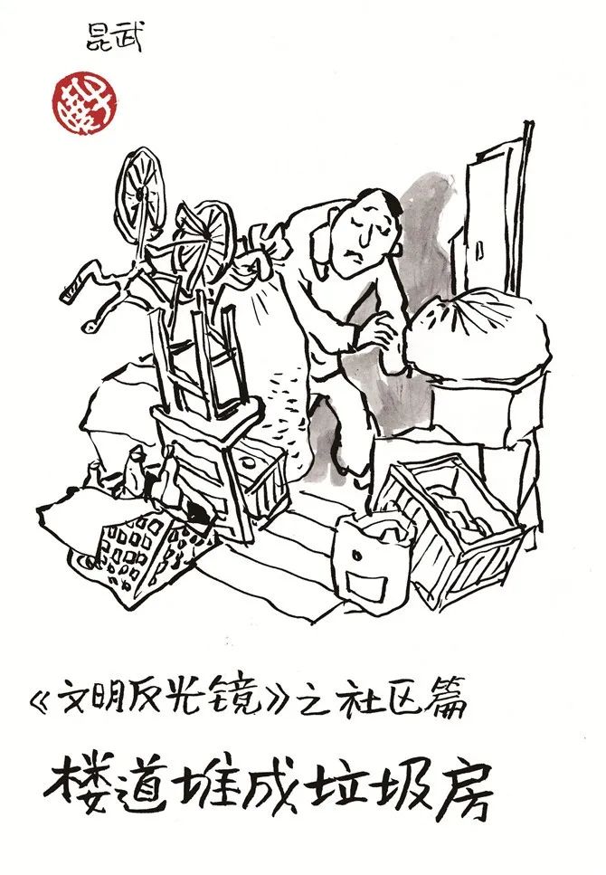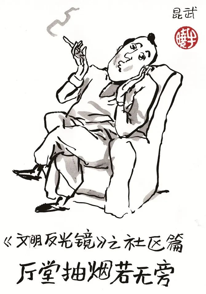 漫画家李昆武作品由知名漫画家李昆武以《昆明市文明行为促进条例》为主线,创作的《文明反光镜》《文明歌谣》《文明宣传画》3个主题的漫画。以日常为原型、以漫画为载体、以文明为内涵,用生动的人物形象、通俗易懂的表达方式,诠释文明理念、倡导文明新风,呼吁广大市民说文明话、行文明事、做文明人,以个人的“微文明”共建城市“大文明”。