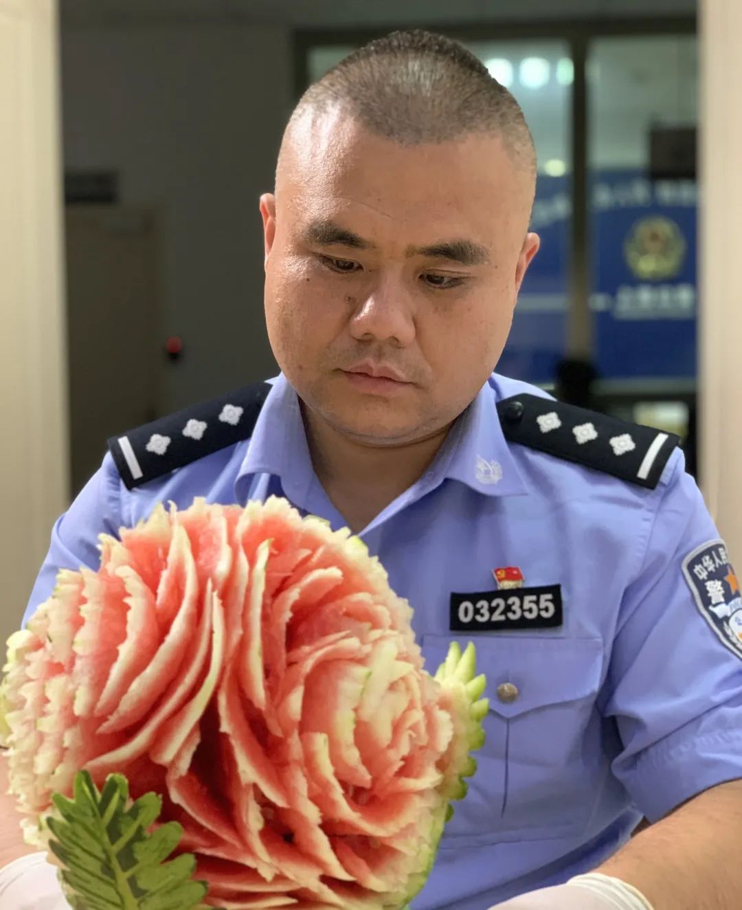 吴永杰正在进行西瓜雕刻曾是标枪运动员