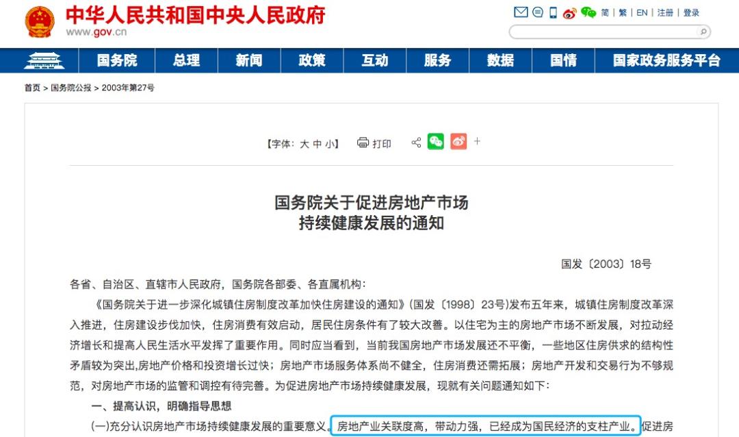 2003年,国务院发布《关于促进房地产市场持续健康发展的通知》,其中提出:“房地产业关联度高,带动力强,已经成为国民经济的支柱产业。各地要根据城镇住房制度改革进程、居民住房状况和收入水平的变化,完善住房供应政策,调整住房供应结构,逐步实现多数家庭购买或承租普通商品住房。”