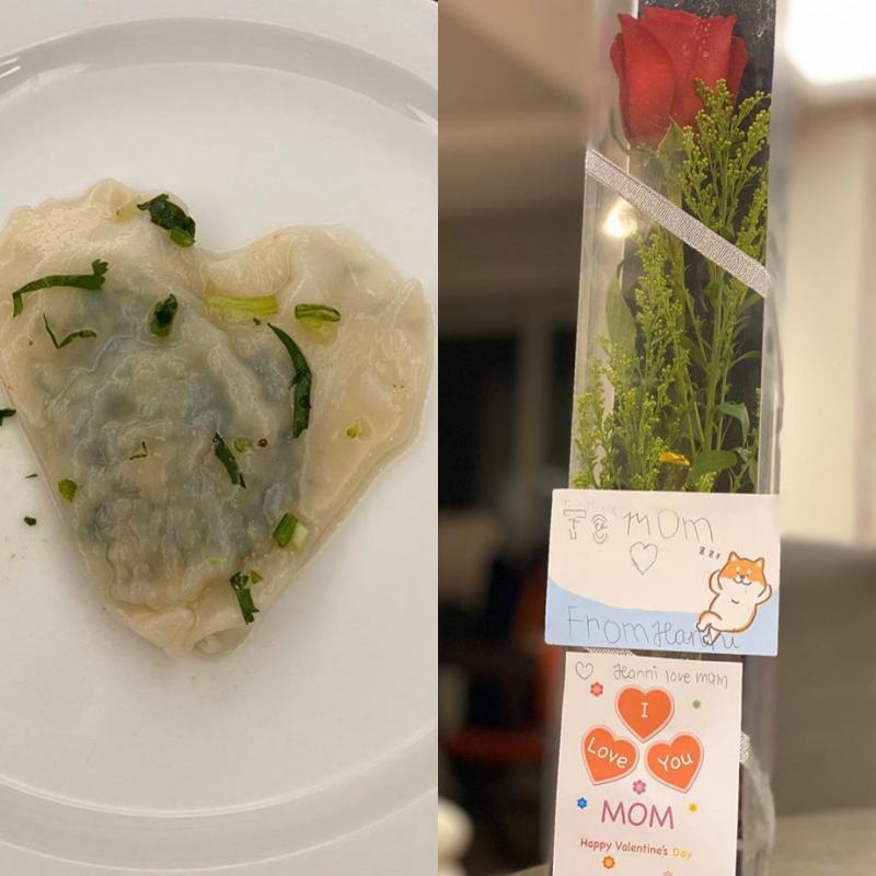 情人节时,会专门为妈妈准备心形的饺子,和一束代表浪漫的红玫瑰。