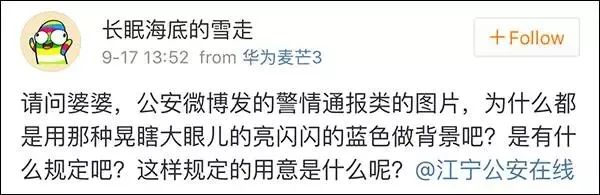 在《警察制服的心理影响》一文中有指出,“从心理学上来说,蓝色会潜意识地给人一种舒适感和安全感,因此对于权威人士来说,蓝色是警察的首选。”而蓝底白字又是最醒目、最清晰的一对反差色配色,能最大程度地减小民众对阅读体验的影响,因此成为警方通报的惯用作法。