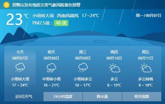 双鸭山市气象台 9 月 7 日 13 时 35 分发布大风蓝色预警信号:预计 9 月 7 日夜间至 8 日白天我市将受大风影响,平均风力 5~6 级,阵风 7 级以上,请有关单位和个人做好预防工作。防御指南: