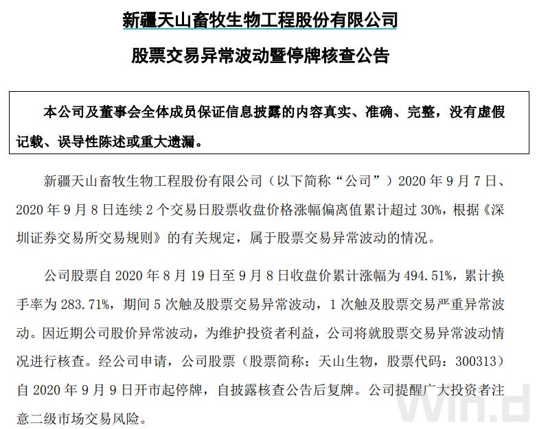 天山生物9月8日晚间公告称,公司股票自9月9日开市起停牌,自披露核查公告后复牌。