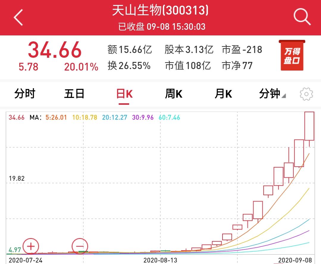 9月8日,此前连续涨停的天山生物再度涨停,若从8月中旬5元附近算起,不到一个月时间,累计涨幅超过500%。