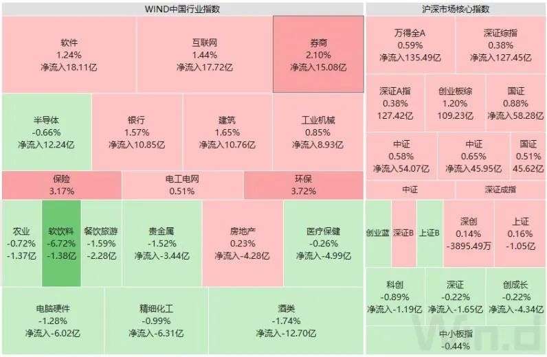 板块方面来看,金融板块周二成为了大盘能够触底反弹的主力军,银行、券商及保险纷纷开启了护盘的节奏,周二保险板块上涨了3.17%更是引领金融板块。而反观券商对于股市的“节拍器”作用表现得淋漓尽致,午后正是随着该板块的上涨市场得以反转,周二券商板块上涨2.1%的同时净流入也达到了15.08亿元。