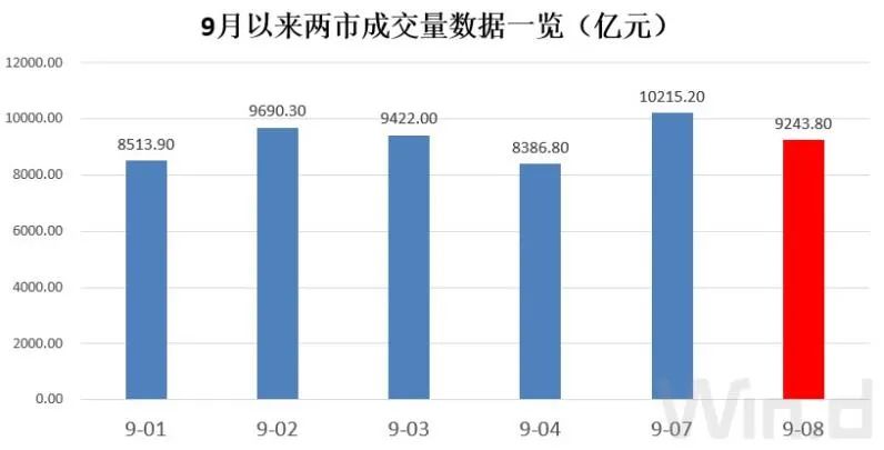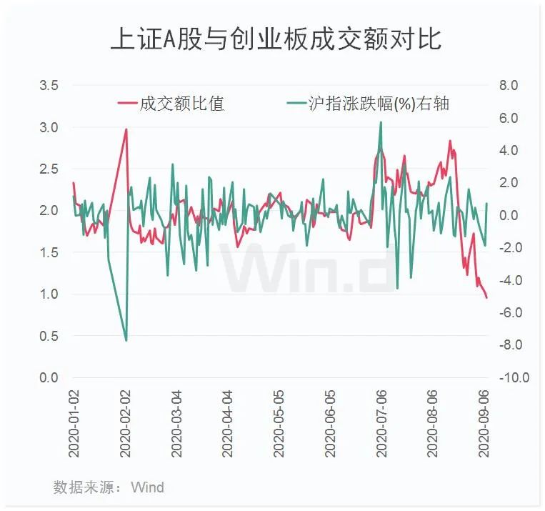 9月8日,创业板成交额达3374.55亿元,维持高位,同时为历史上首次超过上证A股成交额3199.44亿元。通过近几日上证A股与创业板成交额对比可以发现,比值大幅下跌,并跌破1的重要关口,创历史新低,资金涌向创业板也造成主板人气走弱。