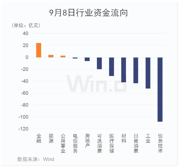 从9月8日行业资金流向来看,累计净流出270多亿元,多数板块资金净流出。其中,金融板块净流入金额超过20亿元,位居首位;此外,能源、公用事业板块小幅净流入。信息技术板块净流出超过100亿元,工业、日常消费、材料板块净流出金额亦较多。
