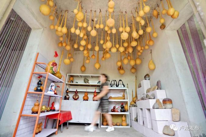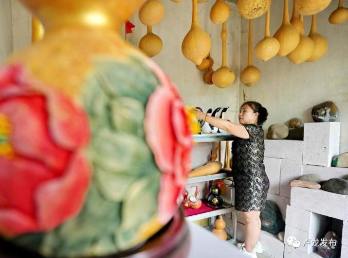 小小的工作间摆放着许多葫芦雕画和石头画作品,是这个普通农家的艺术空间。李志华也经常把得意的作品送给邻居、朋友们,大家一起欣赏,这片和乐水土上生长出的葫芦也越发高产、灵透,让她可以恣意选材创作。