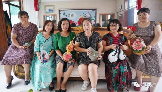 拿着作品合个影,李志华的葫芦雕画让小村庄有了文艺气息。临走,李志华和姐妹们提出让记者帮着合影,大家亲亲热热地坐在一起,怀里抱着的刻画成各种模样的葫芦也似乎都笑盈盈的。