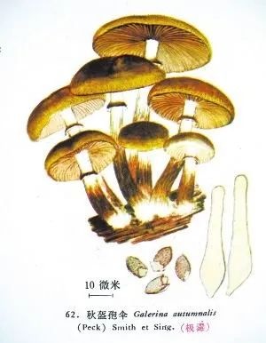 另外一种致命毒蘑菇叫秋盔孢伞。它是一种长在木头上的棕色小蘑菇。棘手的是它与一种俗称蜜蘑菇的可食用蘑菇长在一起,所以误食毒秋盔孢伞的事例屡有发生。鉴别的方法是,当你采到蜜蘑菇后,不要急于食用,先割下它们的伞帽放在一张白纸上,6至8小时后便可发现,蜜蘑菇渗出的汁是白色的,而秋盔孢伞的汁却是棕色的。