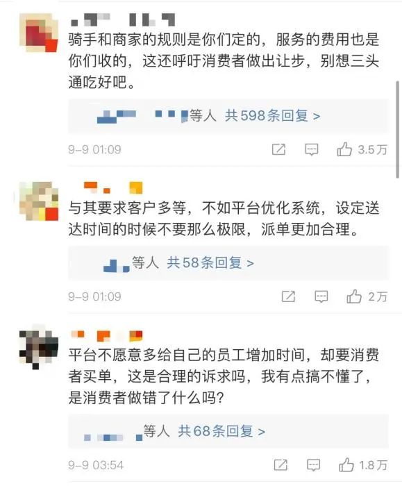 网友建议,与其让消费者多等,不如平台整改优化系统,设定送达的时间不要那么极限,派单更加合理。