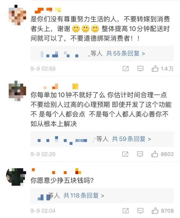 网友评论截图“你愿意少挣5块钱吗?”还有人直言,“这个功能只会被小哥用来多接几单”“我给他多5分钟,他不会用来开慢点走慢点,遵守一下交通规则,只会用来再多接一单,治标不治本”……