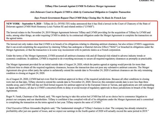 9月9日,Tiffany在美国证券交易委员会(SEC)的文件显示,Tiffany已在特拉华州州法院提起诉讼,要求LVMH实施合并协议,同时向特拉华州法院要求LVMH遵守合同义务才能完成交易,并表示LVMH延迟关闭交易没有相关法律依据。