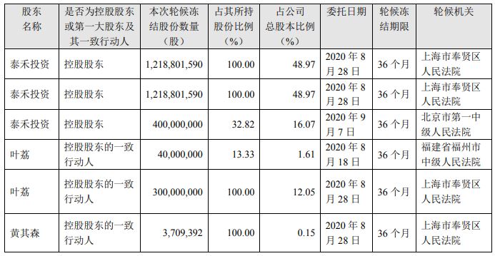 具体来看,泰禾投资所持有的1218801590股股份,即全部股份在8月28日被上海市奉贤区人民法院冻结,泰禾投资4亿股股份被北京市第一中级人民法院冻结,日期为9月7日。叶荔持有的4000万股股份在8月18日被福建省福州市中级人民法院冻结,所持3亿股股份在8月28日被上海市奉贤区人民法院冻结,黄其森持有的3709392股股份在8月28日被上海市奉贤区人民法院冻结,上述股份的轮候冻结期限均为36个月。