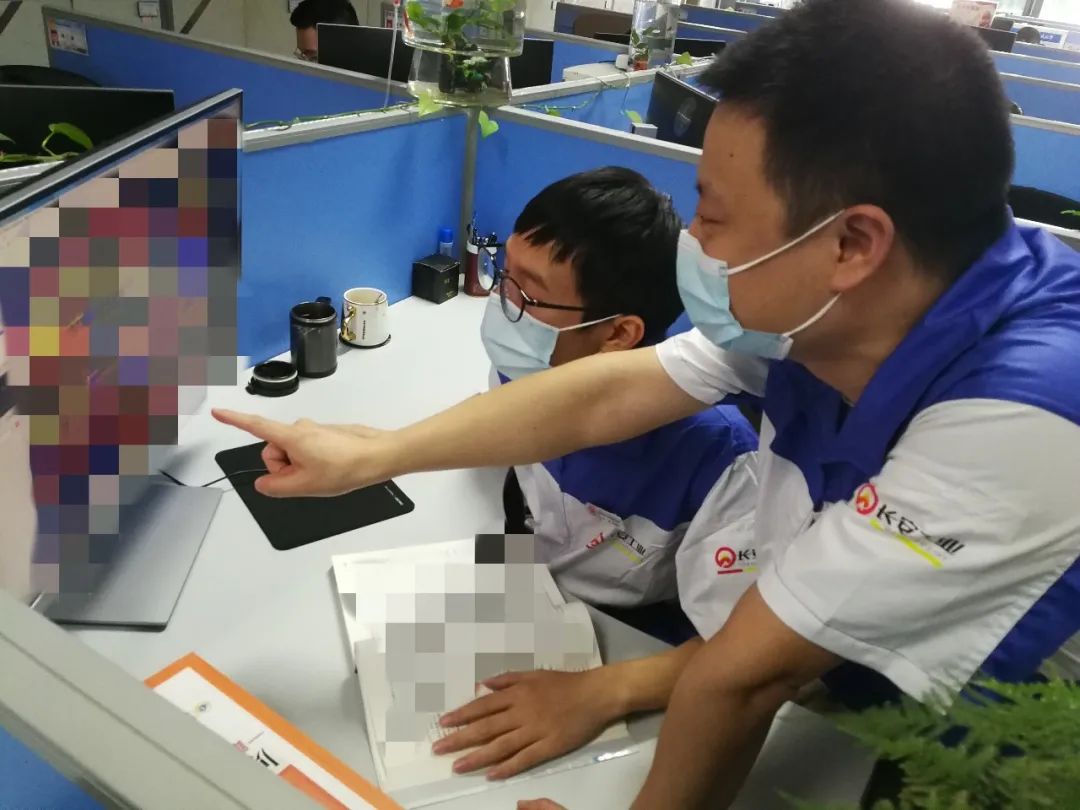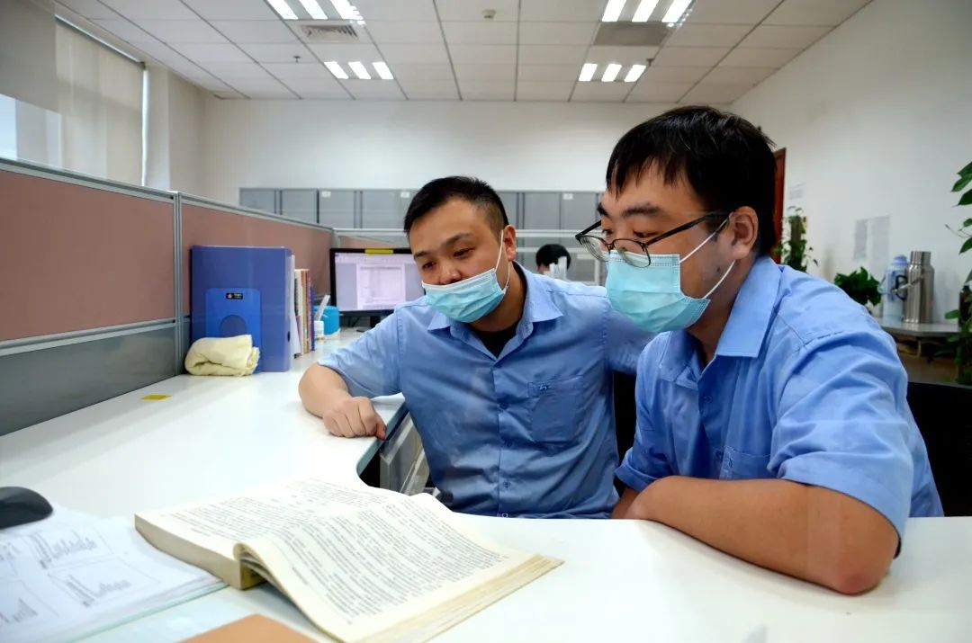 软件室电讯设计岗位的邬瑾扬与新入职员工丁辉志,师徒二人正在合力攻克软件质量体系换版项目中遇到的难题。(辛雯婷)