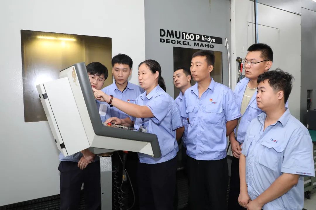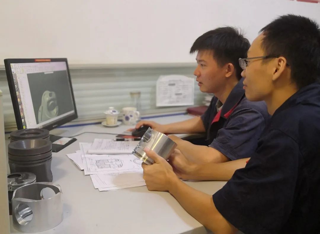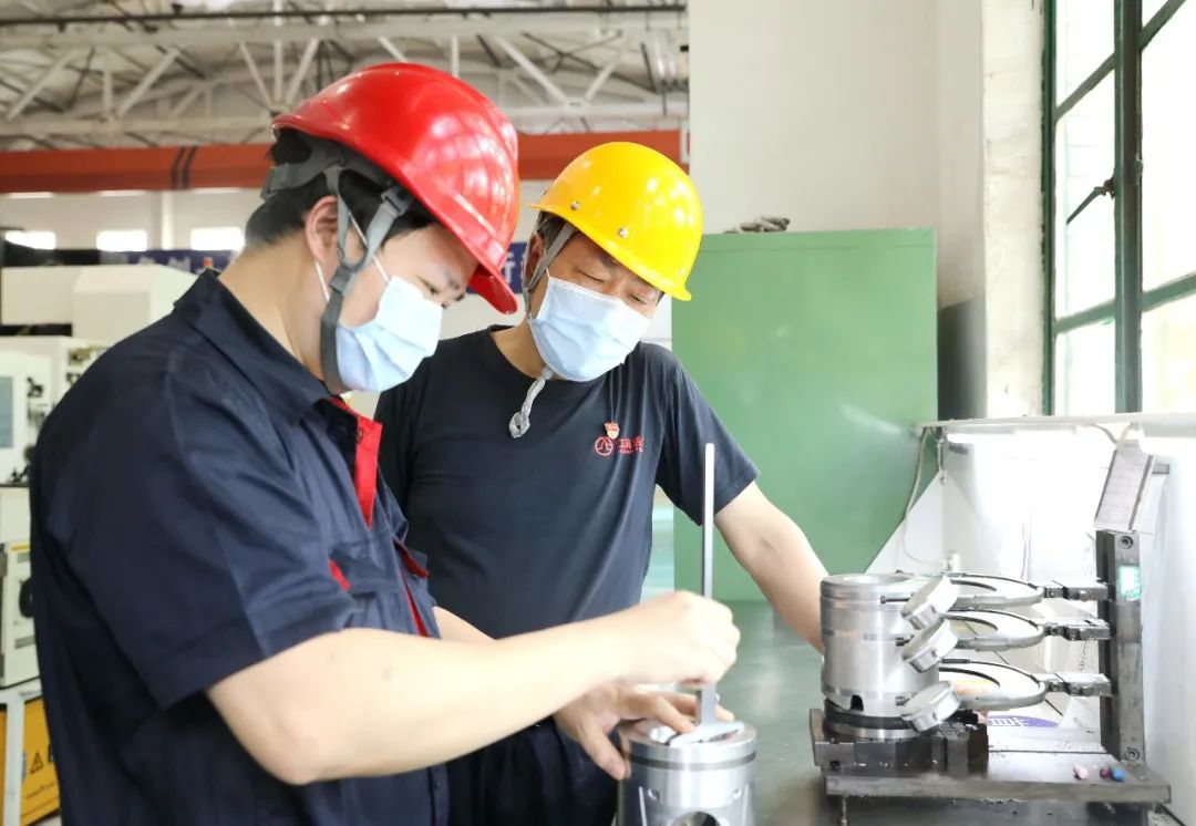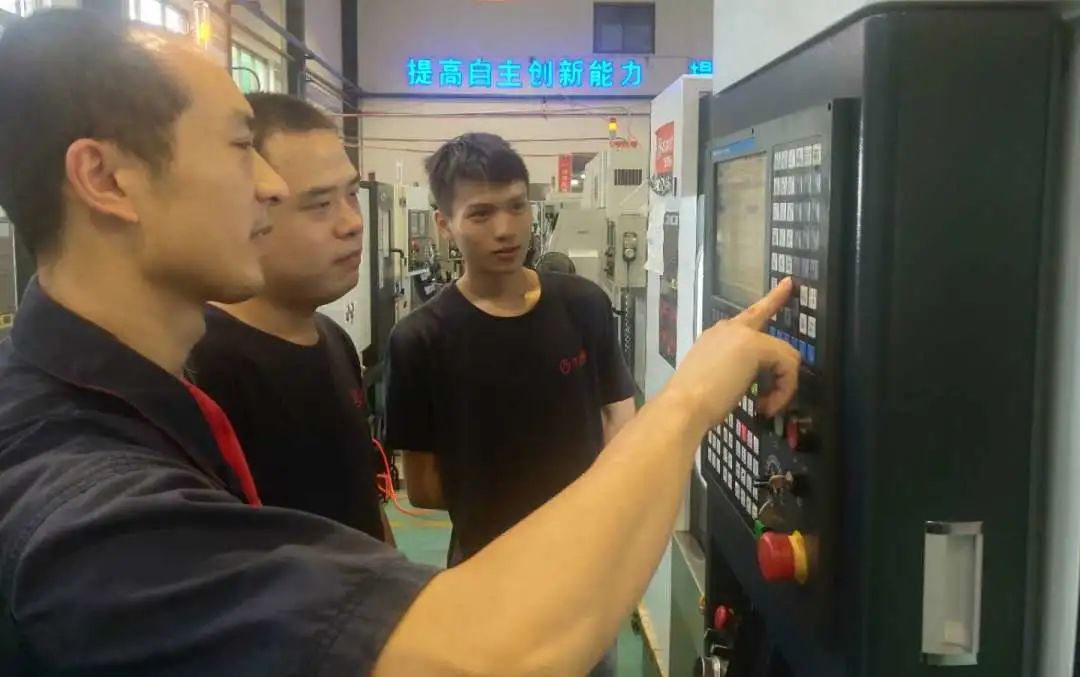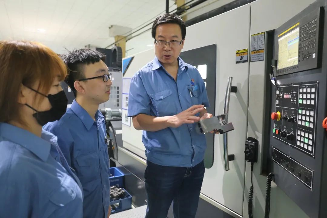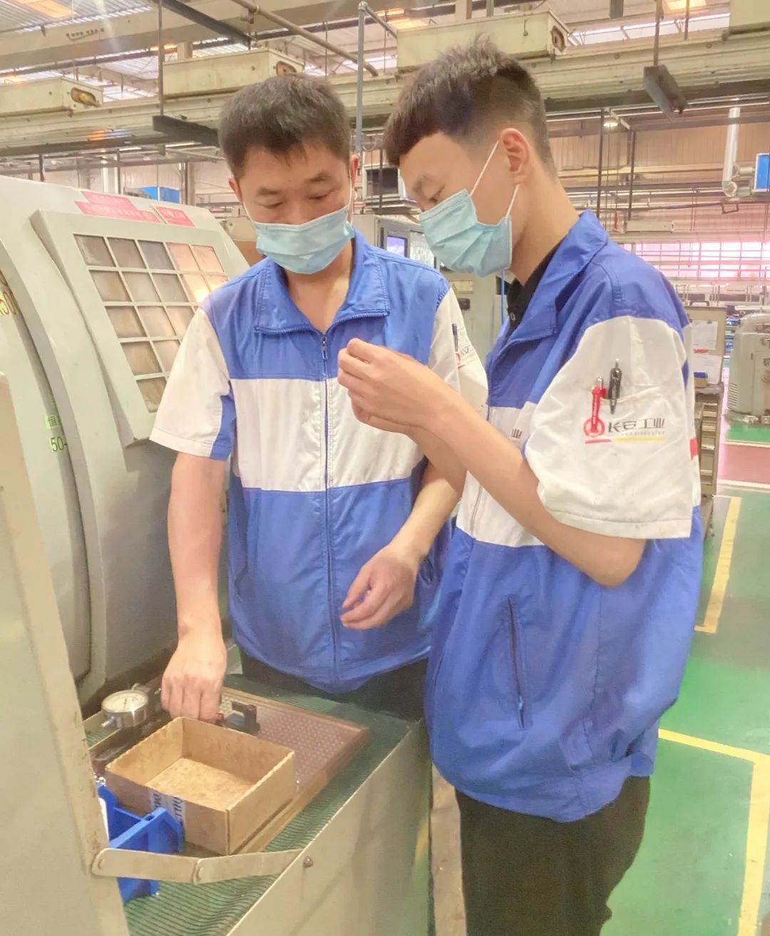 钢活塞厂钢一线班长扶超,利用试制调试切换的时机,向新员工孙鹏、杨智琪手把手现场实战辅导气门程序的编制优化以及刀具安装补偿、夹具校准。(梅策源)