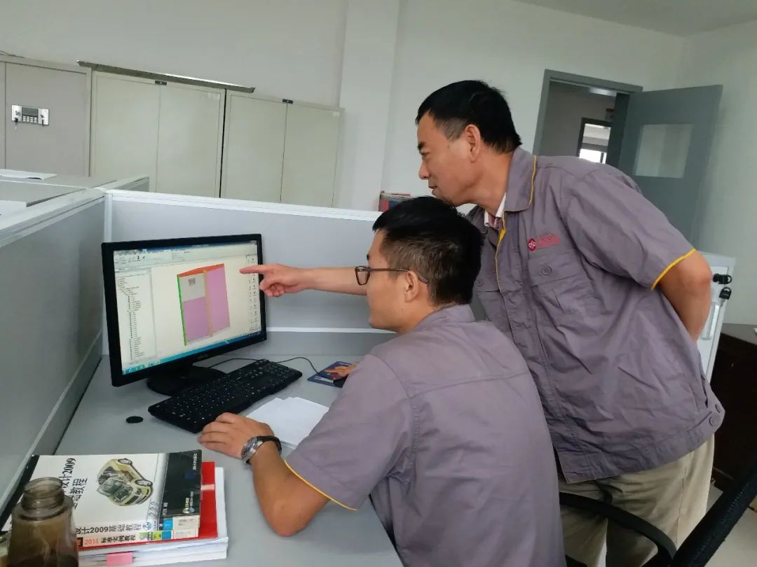 王熹参加工作十余年,理论知识扎实,技术水平过硬,现场经验丰富,尤其擅长三维建模设计。图为王熹为徒弟黄德威细心讲解模具设计。(郑鹏)