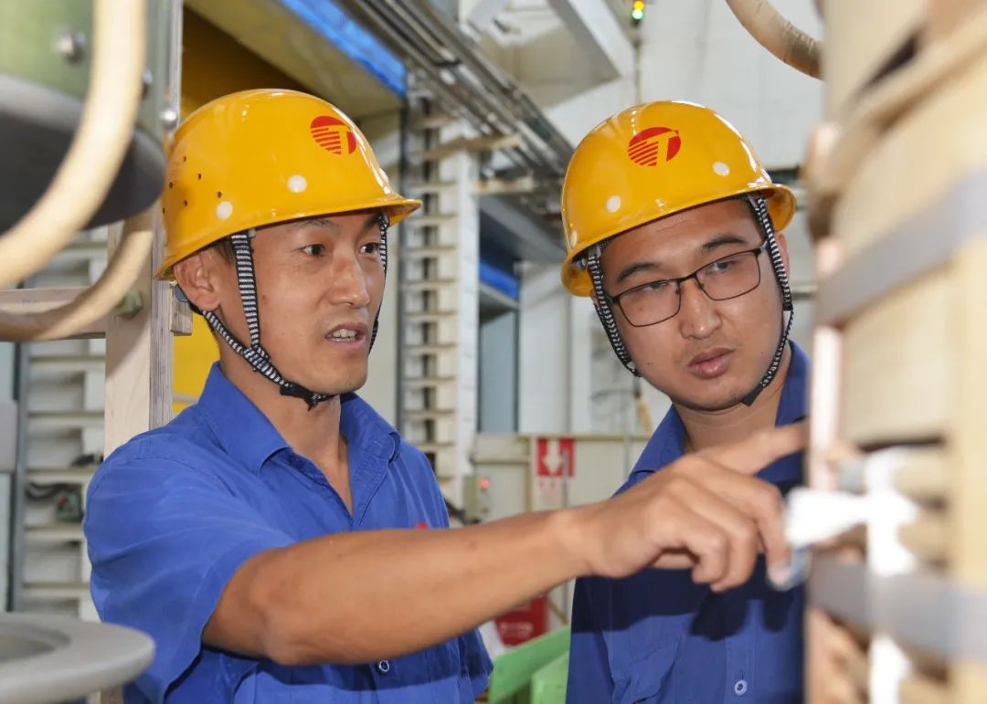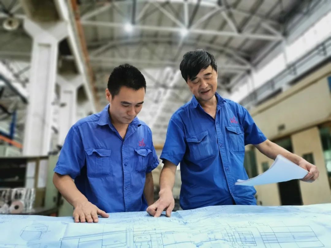 高级工程师、气体绝缘变压器专家边庆恺 ,多年来专注气体绝缘变压器的研发和制造,牵头研制的110kV级SF6气体绝缘电力变压器(系列产品)曾获中国机械工业科学技术三等奖,在自身获得多项荣誉的同时更将自己的所学和所知无私传授给年轻同志。图为边庆恺与徒弟曹会川在生产现场探讨技术改进课题。(李运生)