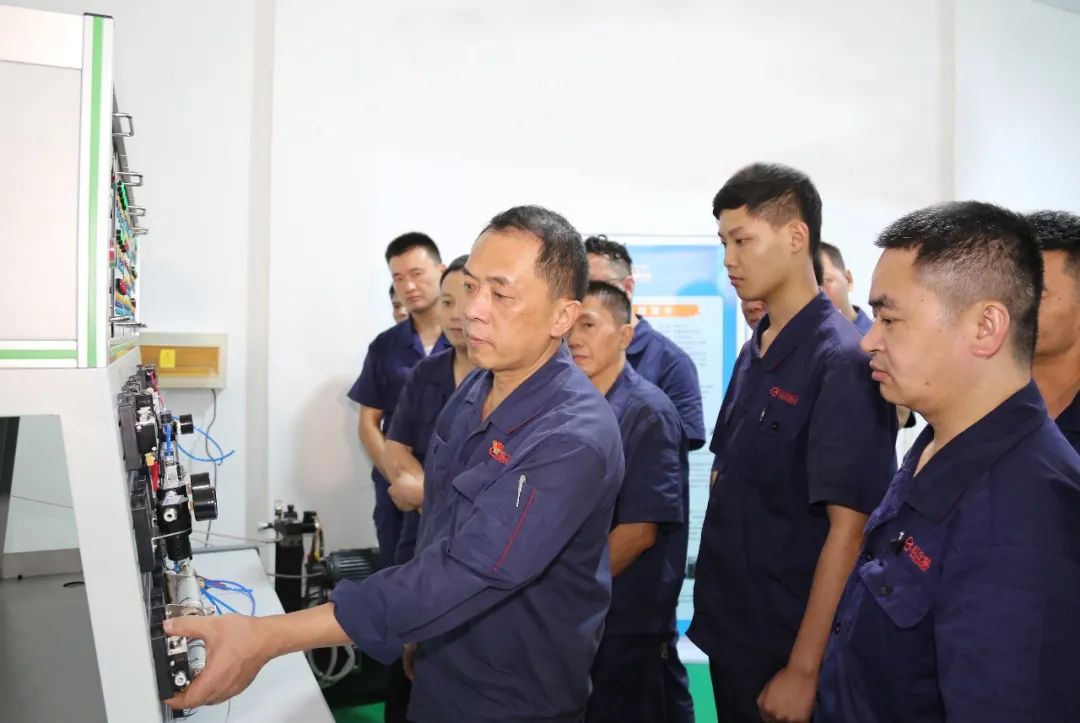 中华技能大奖获得者、全国技术能手、河北省特等劳动模范、兵器装备集团技能带头人、保变电气劳模创新工作室技能带头人王树林正在向徒弟们传授“独门绝技”。(崔刚)