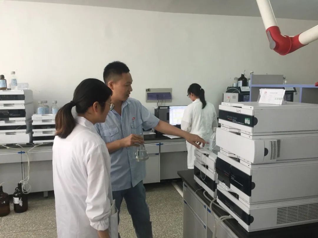 检验员钟彬作为老师细致地给“小徒弟”讲解高效液相色谱仪的检验原理以及操作步骤。(华药宣)