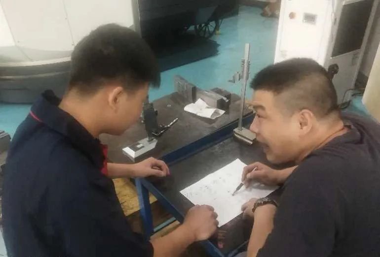 生产保障部精密班班长刘凯手把手地教徒弟蒋宇如何编程,演示计算过程和编程方法 、结合实际解决加工过程中出现的问题。(肖莉萍)