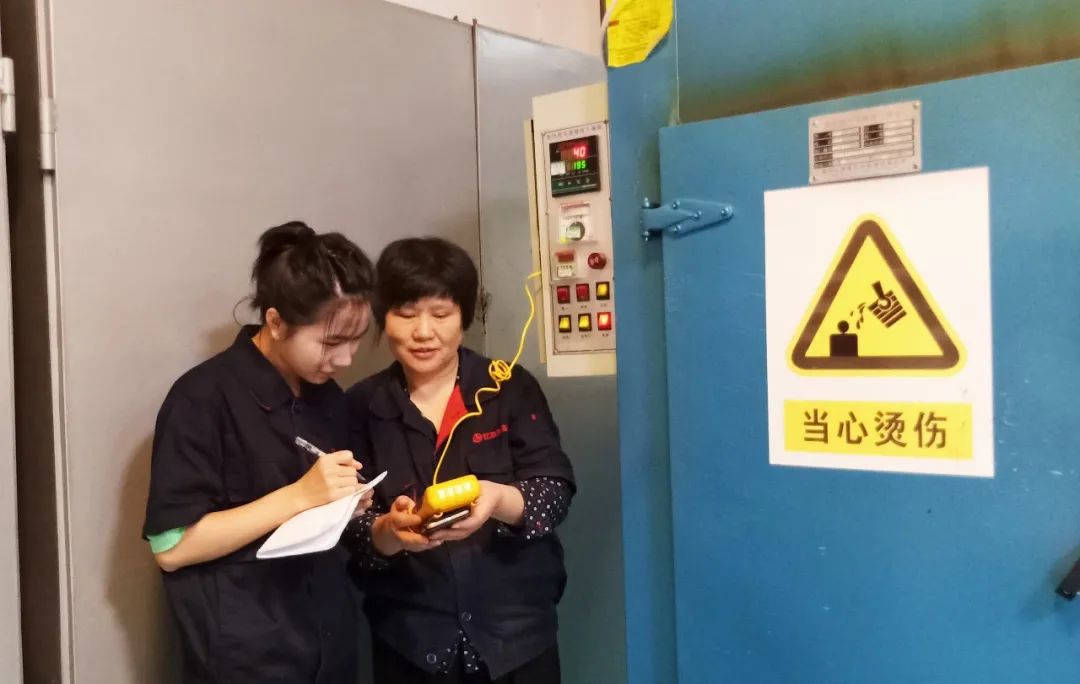 质量管理部中心计量室热工仪表室主要负责公司所有热加生产单位产品温度的测量和控制,以及热加关键设备的炉温均匀性检测和温度控制系统的调试。图为高级工程师刘健带着她的徒弟姜聪正对公司高能束焊活塞时效炉进行温度检测。(陈珊琳)