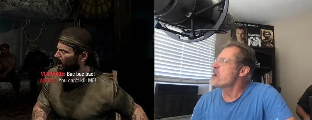 伯恩斯也为伍兹配音了11年,《黑色行动》四部作品中的三部都出现了他那嘶哑的声音。与海特不同,伯恩斯不只负责配音,还参与了人物的动作捕捉,甚至着手为伍兹修改与撰写台词。他真的是在本色出演,完全有资格说一句,“没有人比我更懂伍兹”。