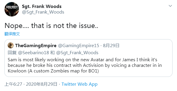 梅森的原配音演员萨姆·沃辛顿正在忙于《阿凡达2》的拍摄工作无暇前来配音,尚且可以理解。但伯恩斯最近没有档期,没被叫去配音的原因十分蹊跷,他与他的粉丝一样,搞不明白动视抛弃自己的理由,而动视的三缄其口更让人捉摸不透。