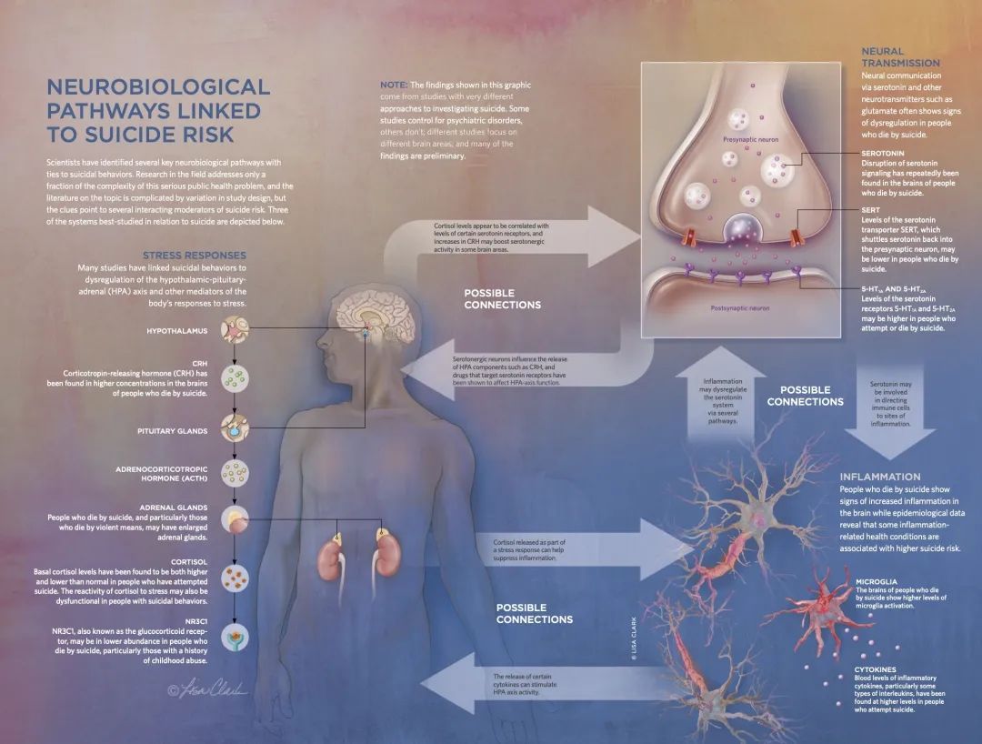 许多研究已经将自杀行为与HPA轴,以及其他应激反应介质的失调联系起来。