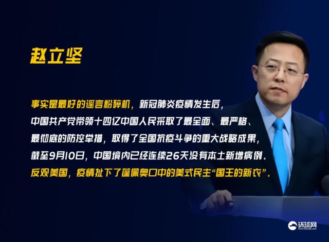 赵立坚资料图赵立坚在当天举行的外交部记者会上表示,事实是最好的谣言粉碎机,新冠肺炎疫情发生后,中国共产党带领十四亿中国人民采取了最全面、最严格、最彻底的防控举措,取得了全国抗疫斗争的重大战略成果,截至9月10日,中国境内已经连续26天没有本土新增病例。反观美国,疫情扯下了蓬佩奥口中的美式民主“国王的新衣”。
