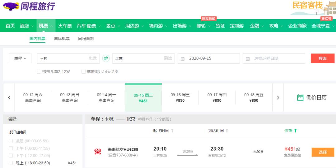 同程网的航班信息玉林飞北京航班班次为HU6268,可从玉林飞抵北京首都机场,玉林起飞时间是20:10,在首都机场降落时间为23:30,用时3小时20分钟,同程网票价为451元、飞猪为460元。